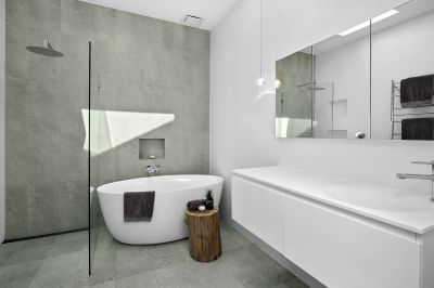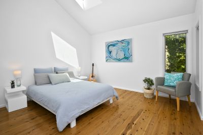 _Master retreat with raked ceilings, skylights, leafy outlook, stunning ensuite with freestanding bath
