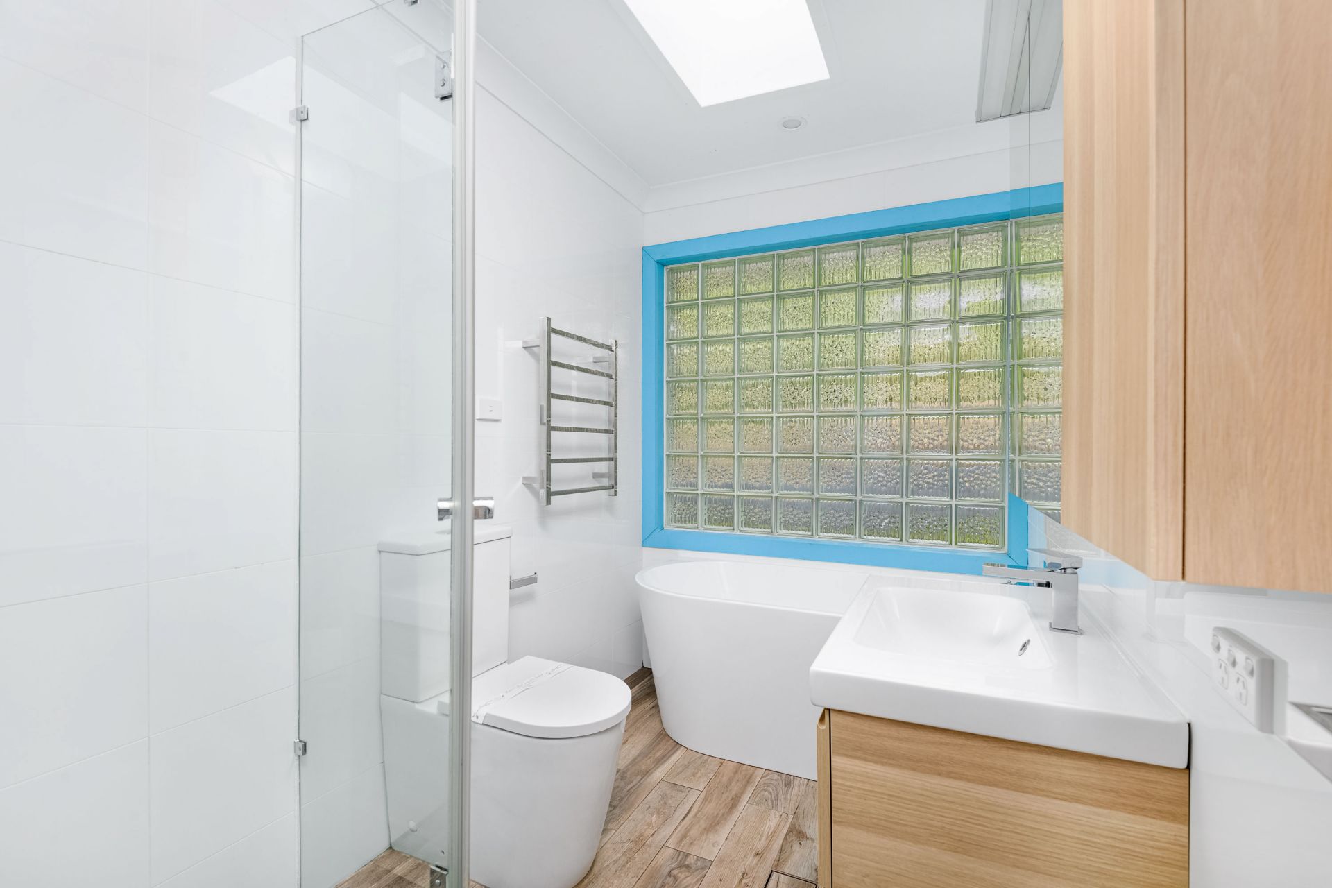 _Modern family bathroom with glass wall and freestanding bath