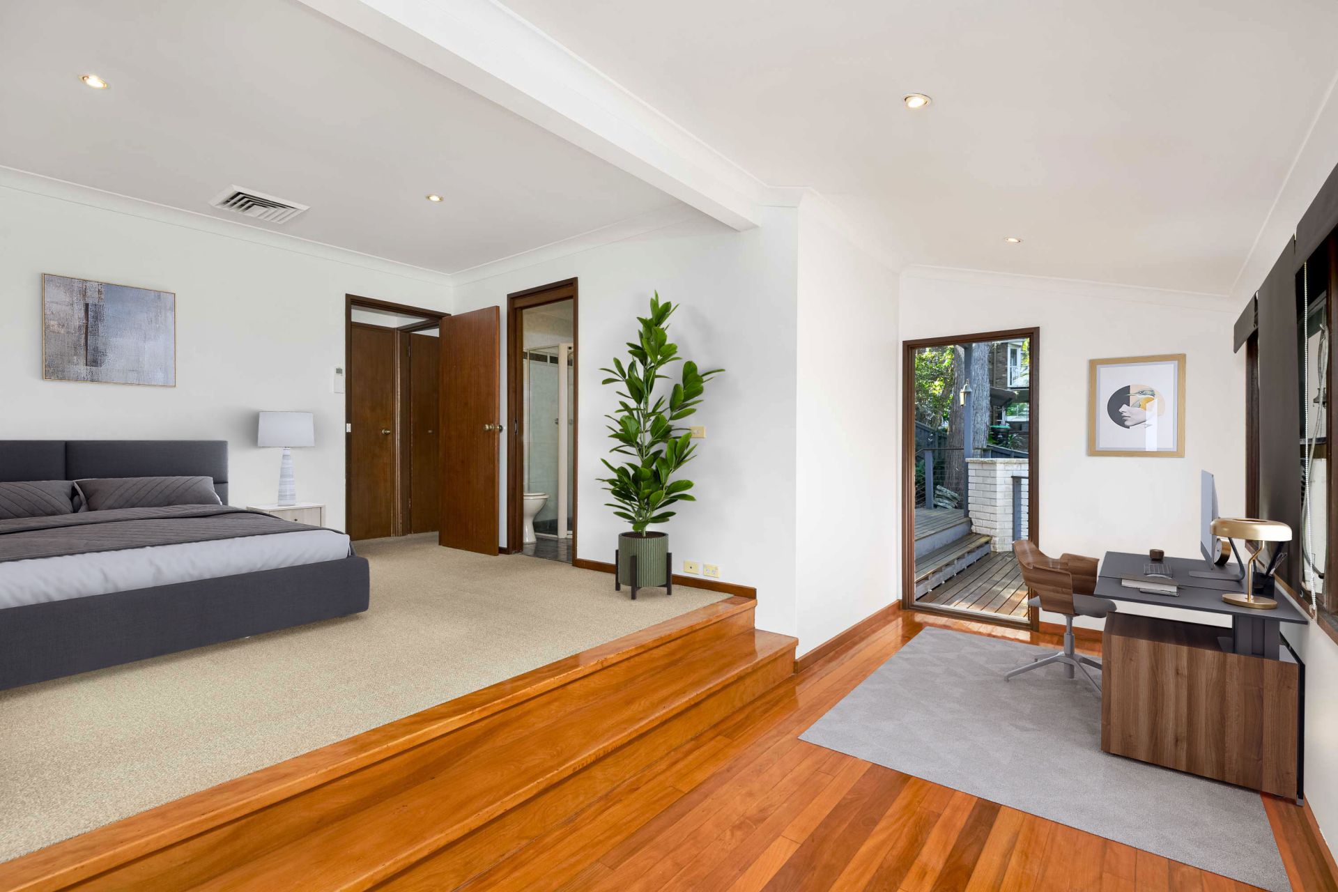 _Master suite offers bush backdrop, ensuite with corner spa and sunken sunroom/office