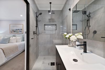 _Chic renovated laundry and lower bathroom with stone benchtops